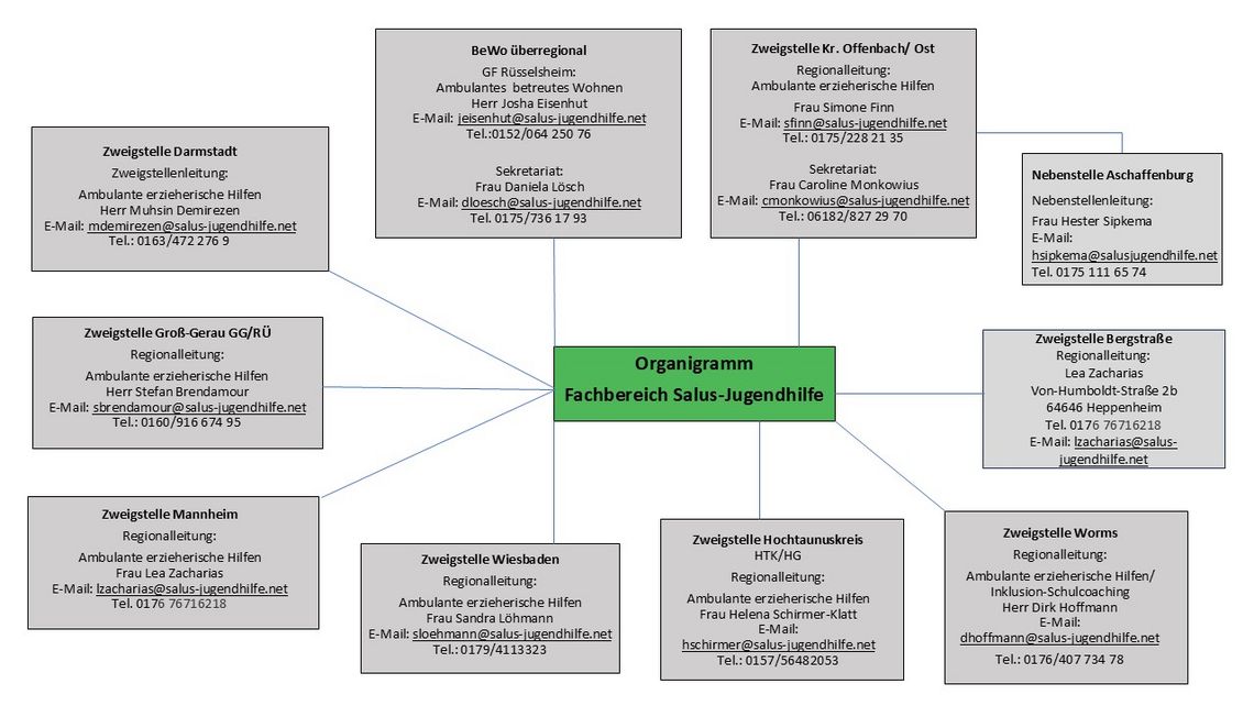 Die Salus-Jugendhilfe unterhält neben der Hauptstelle in Groß-Gerau auch Zweigstellen in Rüsselsheim, Darmstadt, Bergstraße/ Rhein-Neckar-Kreis, Mannheim, Oberursel/Hochtaunuskreis, Offenbach (Ost) in Seligenstadt mit der Nebenstelle in Aschaffenburg, Worms, und Wiesbaden. Die Ansprechpartner der Hauptstelle, den Zweigstellen und der Nebenstelle finden Sie in den Organigrammen der Salus-Gesellschaft und der Salus-Jugendhilfe.